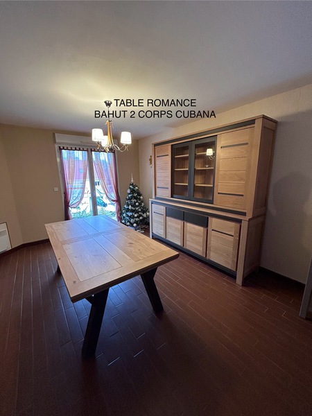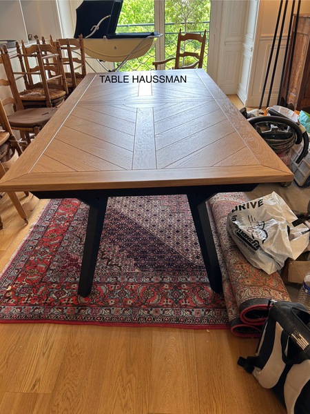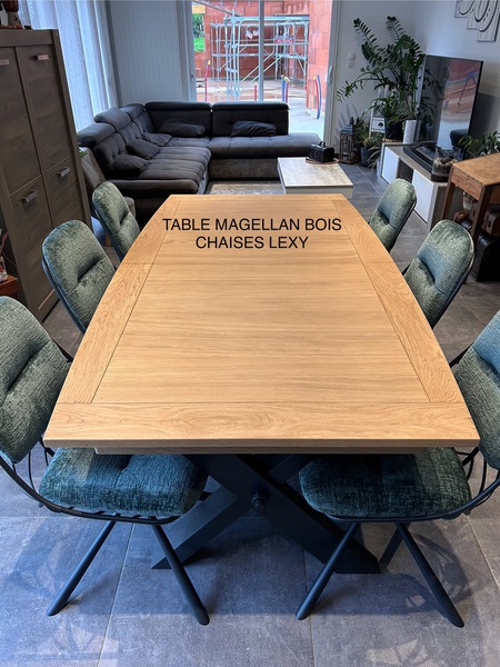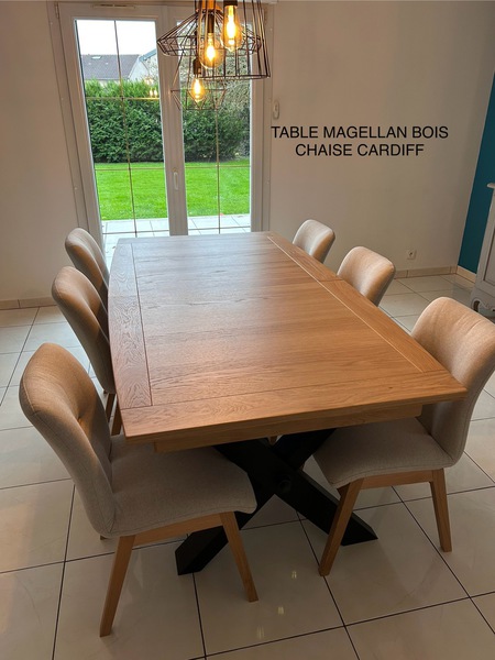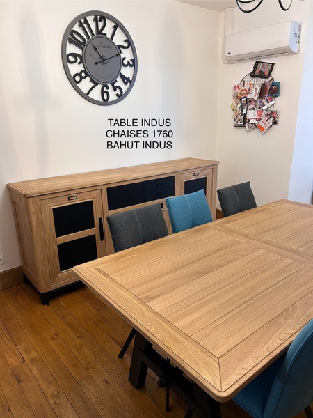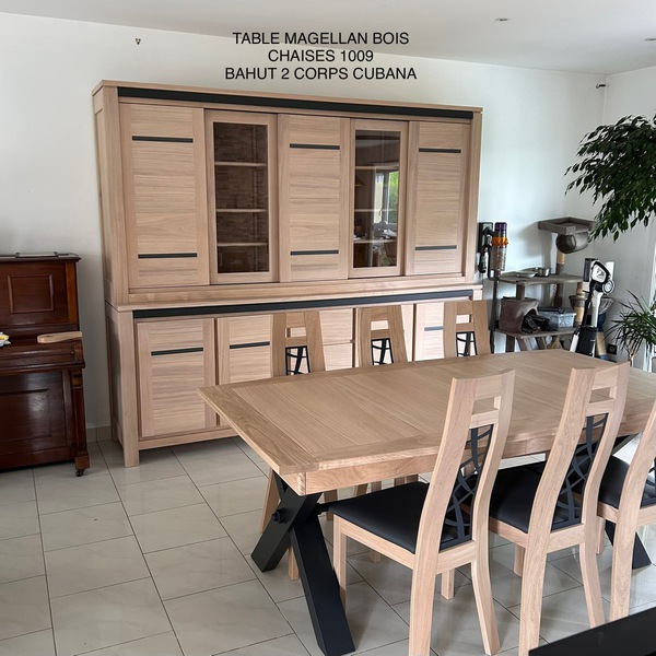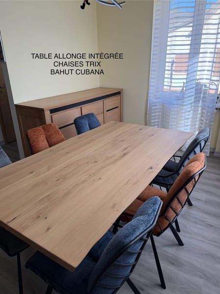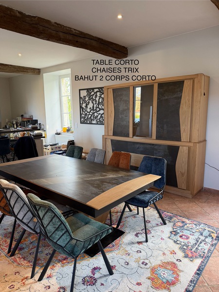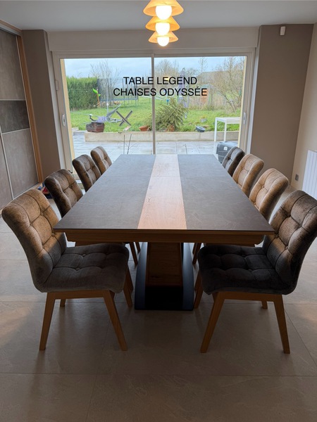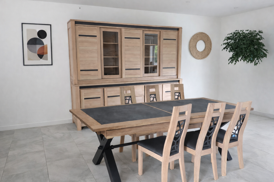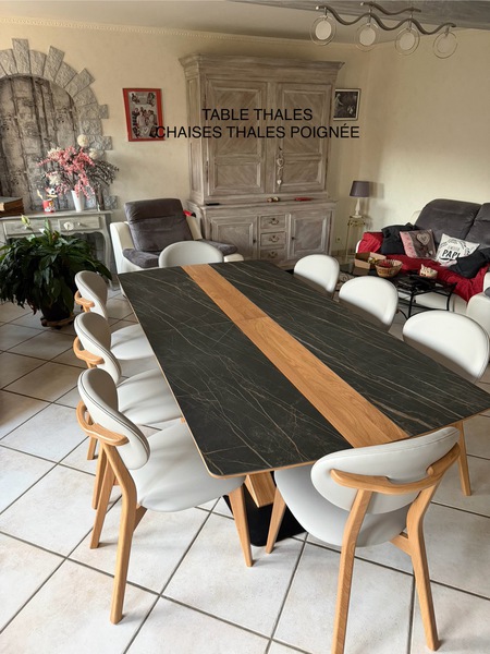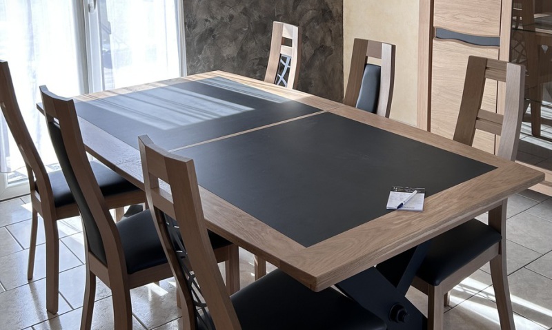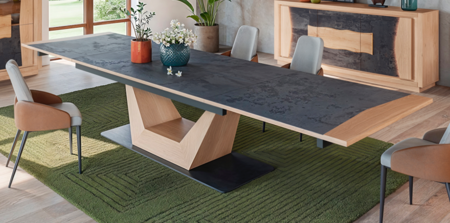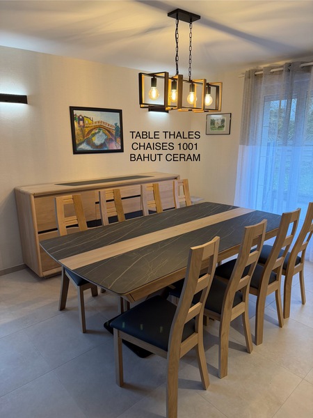 Table contemporaine en céramique alaisée chêne 3 allonges, 2mx107 fixe ; 1 allonge=265x107;3 allonges=357x107 pour recevoir jusqu à 16 personnes