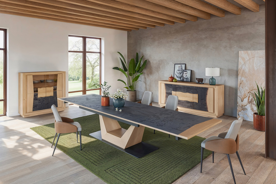 Cette toute dernière nouveautée, en chêne et céramique, vous propose un ensemble de meubles avec sa table XXL. Avec un large choix de teinte et de céramique, cette collection intemporelle saura sublimé votre intérieur.