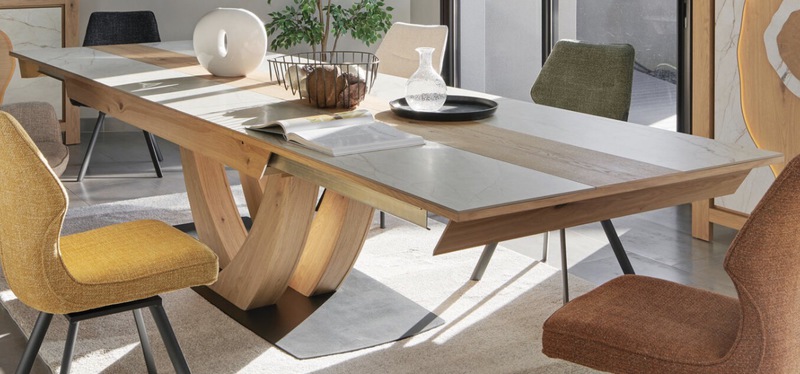 Table Riviera XXL pied central en chêne en 220x110 + 1 allonge en portefeuille de 80 + 2 de 45