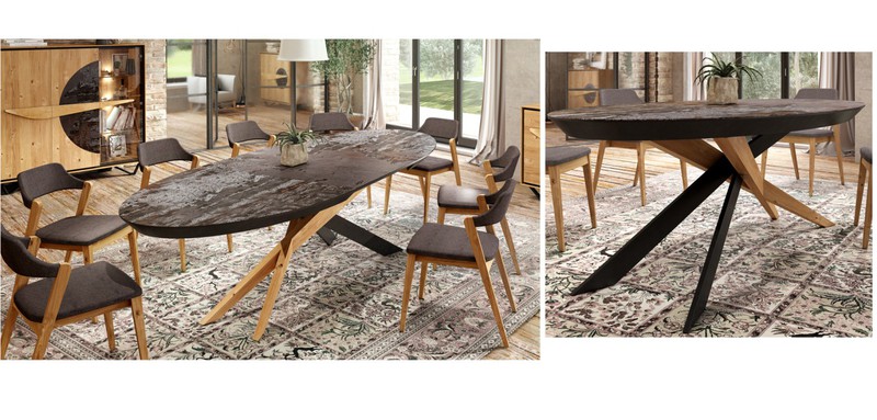 Table ovale Cancale, plateau céramique, pieds chêne et métal